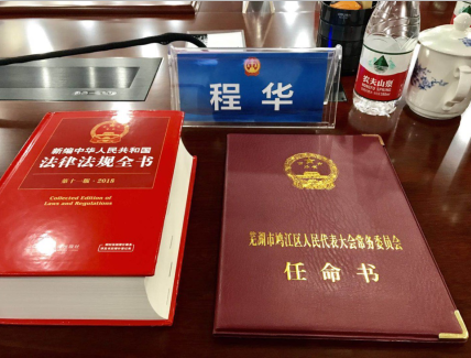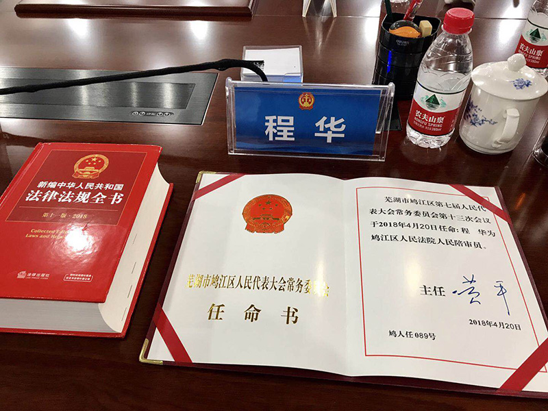 2018年5月24日,鸠江区人民陪审员受聘任命大会在芜湖经济技术开发区人民法院一号会议室胜利举行。九体育·体育董事长程华经芜湖市鸠江区第七届人民代表大会常务委员会第十三次会议通过,任命为鸠江区人民法院人民陪审员,任期5年。